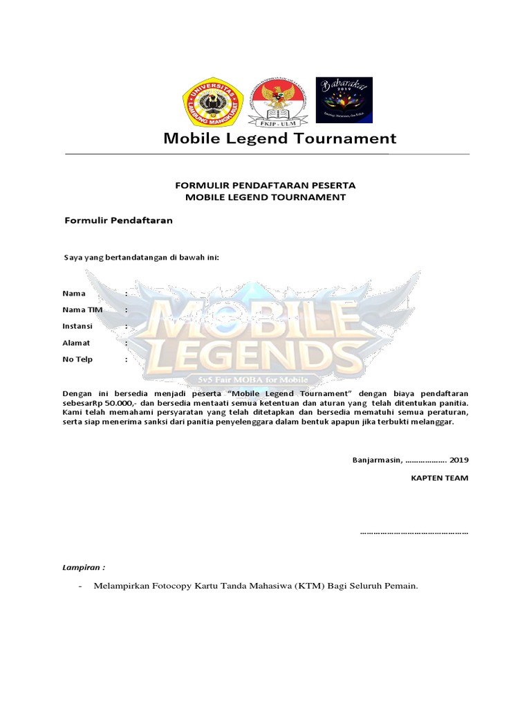 Formulir Pendaftaran Turnamen Mobile Legend : Hachi Mobile Legend Mini Cup Hachi Info / Nov 05, 2020 · proposal turnamen mobile legends.. Silahkan input ulang jika ada kesalahan! Jun 15, 2017 · pahami peraturan turnament mobile legends sea cup 2017 dengan lengkap disini 15 juni 2017 damarbahbah 1 komentar game , mobile , mobile game , mobile legends dengan mengetahui peraturan tournament, membuat squad team lebih paham apa yang harus dilakukan 085606969230 petunjuk pelaksanaan dan petunjuk teknis lomba mobile legend glowmotion Biaya pendataftaran mobile legends tournament sebesar rp. Biaya pendaftaran harus diberikan sebelum pendaftaran ditutup secara langsung atau ditransfer melalui rekening :